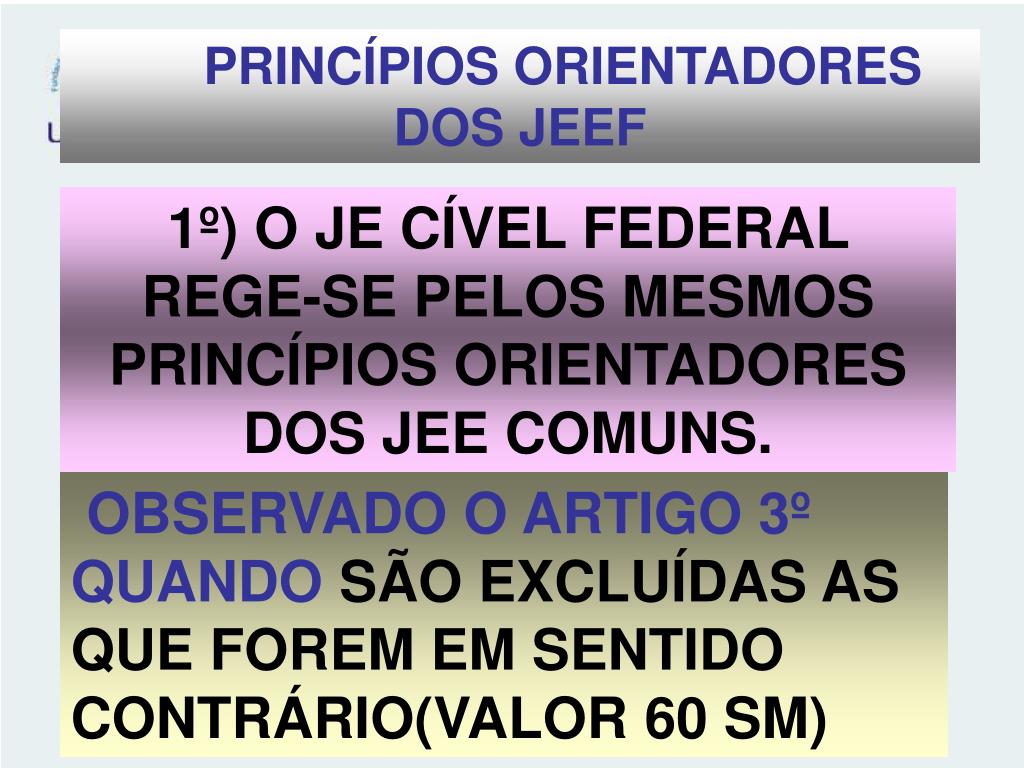 PRINCÍPIOS ORIENTADORES DOS JEEF D 1º) O JE CÍVEL FEDERAL REGE-SE PELOS MESMOS PRINCÍPIOS ORIENTADORES DOS JEE COMUNS. OBSERVADO O ARTIGO 3º QUANDO SÃO EXCLUÍDAS AS QUE FOREM EM SENTIDO CONTRÁRIO(VALOR 60 SM)