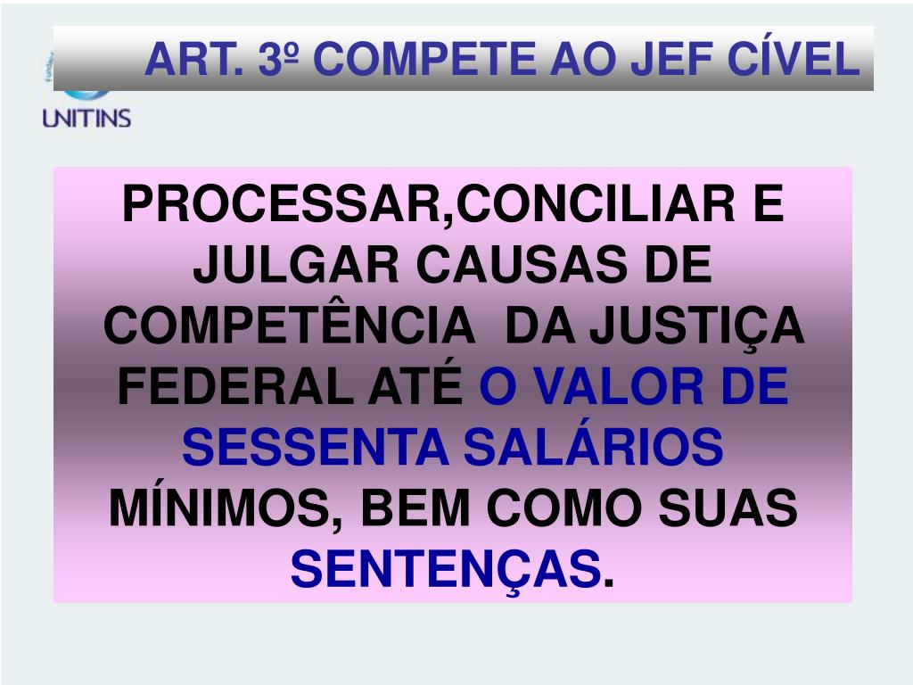 ART. 3º COMPETE AO JEF CÍVEL D PROCESSAR,CONCILIAR E JULGAR CAUSAS DE COMPETÊNCIA DA JUSTIÇA FEDERAL ATÉ O VALOR DE SESSENTA SALÁRIOS MÍNIMOS, BEM COMO SUAS SENTENÇAS.