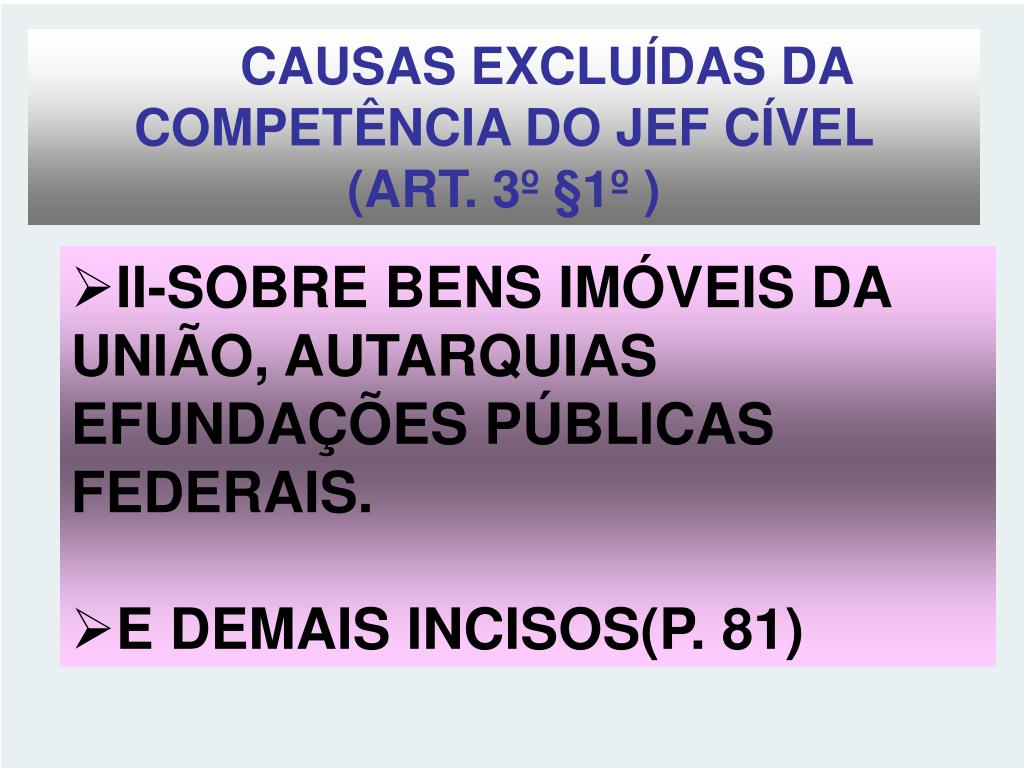 CAUSAS EXCLUÍDAS DA COMPETÊNCIA DO JEF CÍVEL (ART. 3º §1º ) D • II-SOBRE BENS IMÓVEIS DA UNIÃO, AUTARQUIAS EFUNDAÇÕES PÚBLICAS FEDERAIS. • E DEMAIS INCISOS(P. 81)