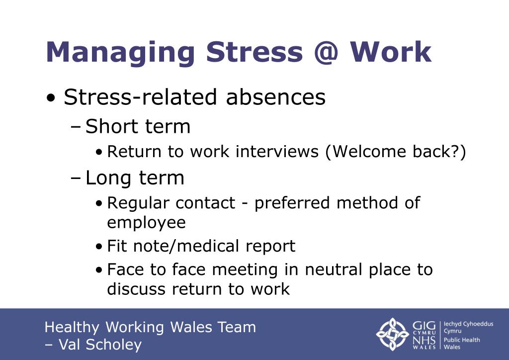 Managing Stress @ Work • Stress-related absences • Short term • Return to work interviews (Welcome back?) • Long term • Regular contact - preferred method of employee • Fit note/medical report • Face to face meeting in neutral place to discuss return to work Healthy Working Wales Team – Val Scholey