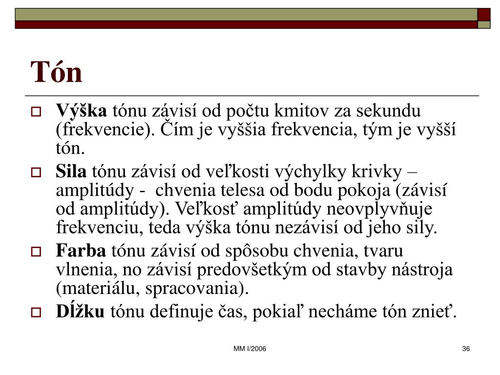 Tón • Výška tónu závisí od počtu kmitov za sekundu (frekvencie). Čím je vyššia frekvencia, tým je vyšší tón. • Sila tónu závisí od veľkosti výchylky krivky – amplitúdy - chvenia telesa od bodu pokoja (závisí od amplitúdy). Veľkosť amplitúdy neovplyvňuje frekvenciu, teda výška tónu nezávisí od jeho sily. • Farba tónu závisí od spôsobu chvenia, tvaru vlnenia, no závisí predovšetkým od stavby nástroja (materiálu, spracovania). • Dĺžku tónu definuje čas, pokiaľ necháme tón znieť. MM I/2006