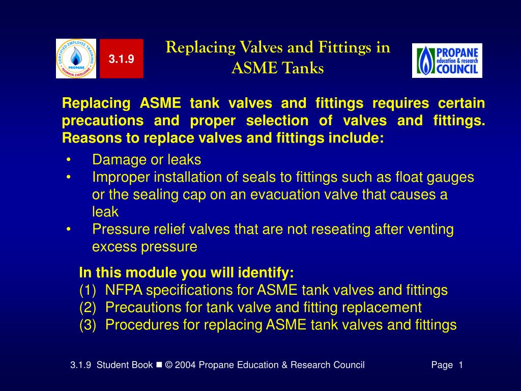 3.1.9 Replacing Valves and Fittings in ASME Tanks Replacing ASME tank valves and fittings requires certain precautions and proper selection of valves and fittings. Reasons to replace valves and fittings include: • Damage or leaks • Improper installation of seals to fittings such as float gauges or the sealing cap on an evacuation valve that causes a leak • Pressure relief valves that are not reseating after venting excess pressure • In this module you will identify: • NFPA specifications for ASME tank valves and fittings • Precautions for tank valve and fitting replacement • Procedures for replacing ASME tank valves and fittings