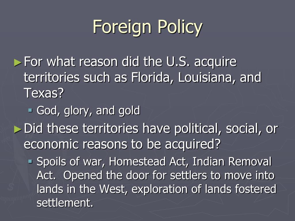 Foreign Policy • For what reason did the U.S. acquire territories such as Florida, Louisiana, and Texas? • God, glory, and gold • Did these territories have political, social, or economic reasons to be acquired? • Spoils of war, Homestead Act, Indian Removal Act. Opened the door for settlers to move into lands in the West, exploration of lands fostered settlement.