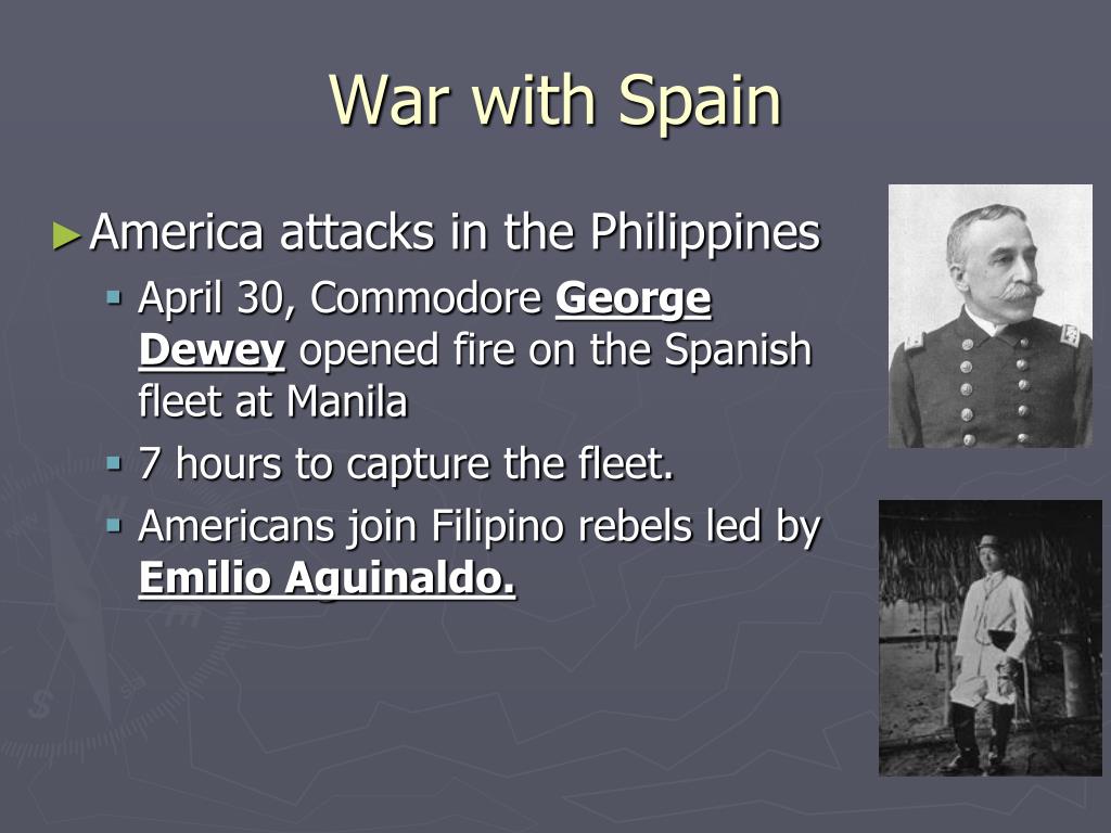 War with Spain • America attacks in the Philippines • April 30, Commodore George Dewey opened fire on the Spanish fleet at Manila • 7 hours to capture the fleet. • Americans join Filipino rebels led by Emilio Aguinaldo.