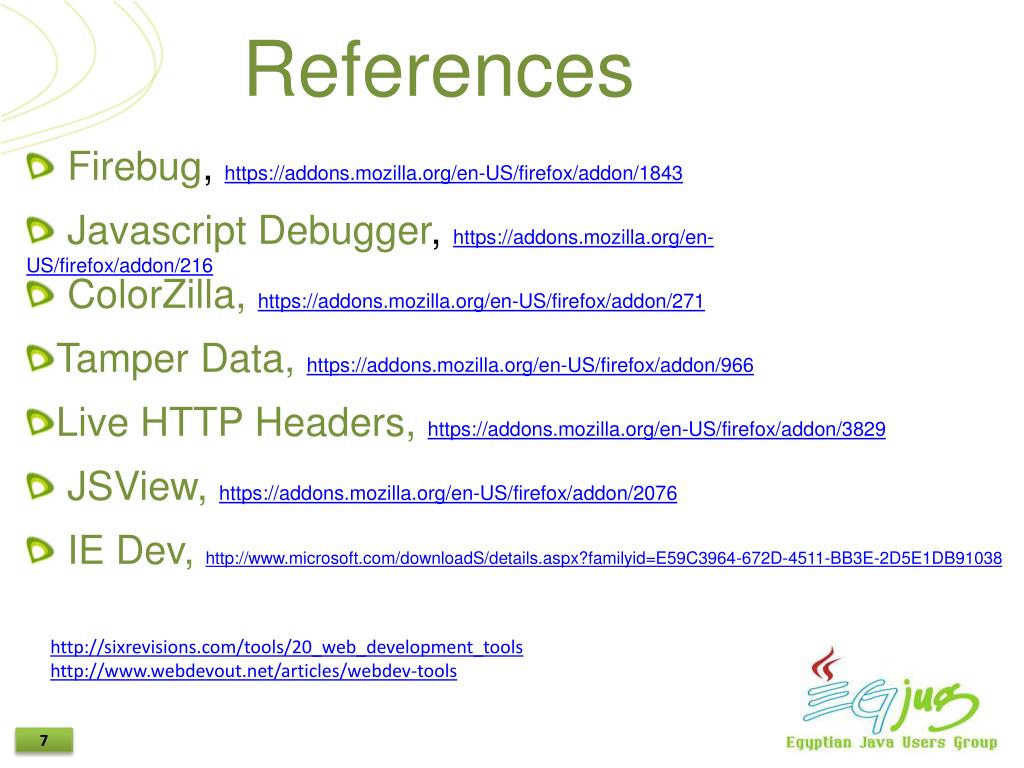 References Firebug, https://addons.mozilla.org/en-US/firefox/addon/1843 Javascript Debugger, https://addons.mozilla.org/en-US/firefox/addon/216 ColorZilla, https://addons.mozilla.org/en-US/firefox/addon/271 Tamper Data, https://addons.mozilla.org/en-US/firefox/addon/966 Live HTTP Headers, https://addons.mozilla.org/en-US/firefox/addon/3829 JSView, https://addons.mozilla.org/en-US/firefox/addon/2076 IE Dev, http://www.microsoft.com/downloadS/details.aspx?familyid=E59C3964-672D-4511-BB3E-2D5E1DB91038 http://sixrevisions.com/tools/20_web_development_tools http://www.webdevout.net/articles/webdev-tools