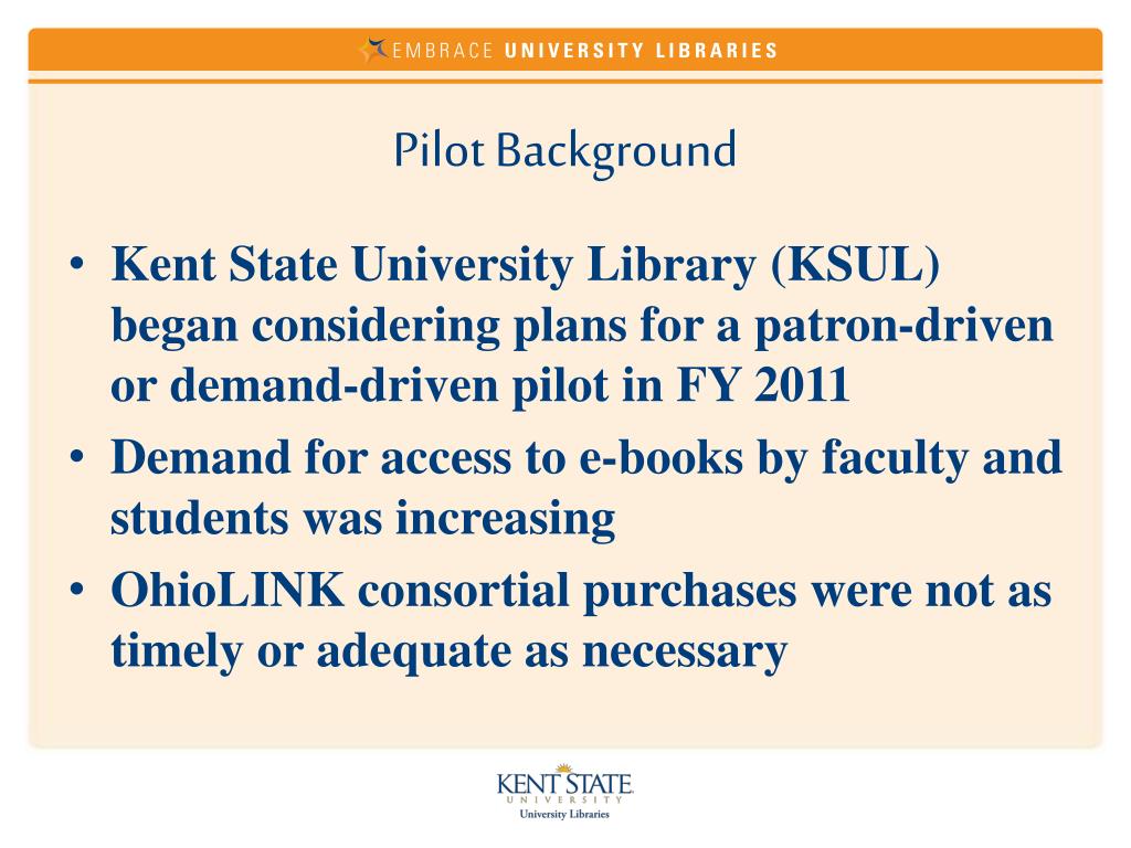 Pilot Background • Kent State University Library (KSUL) began considering plans for a patron-driven or demand-driven pilot in FY 2011 • Demand for access to e-books by faculty and students was increasing • OhioLINK consortial purchases were not as timely or adequate as necessary