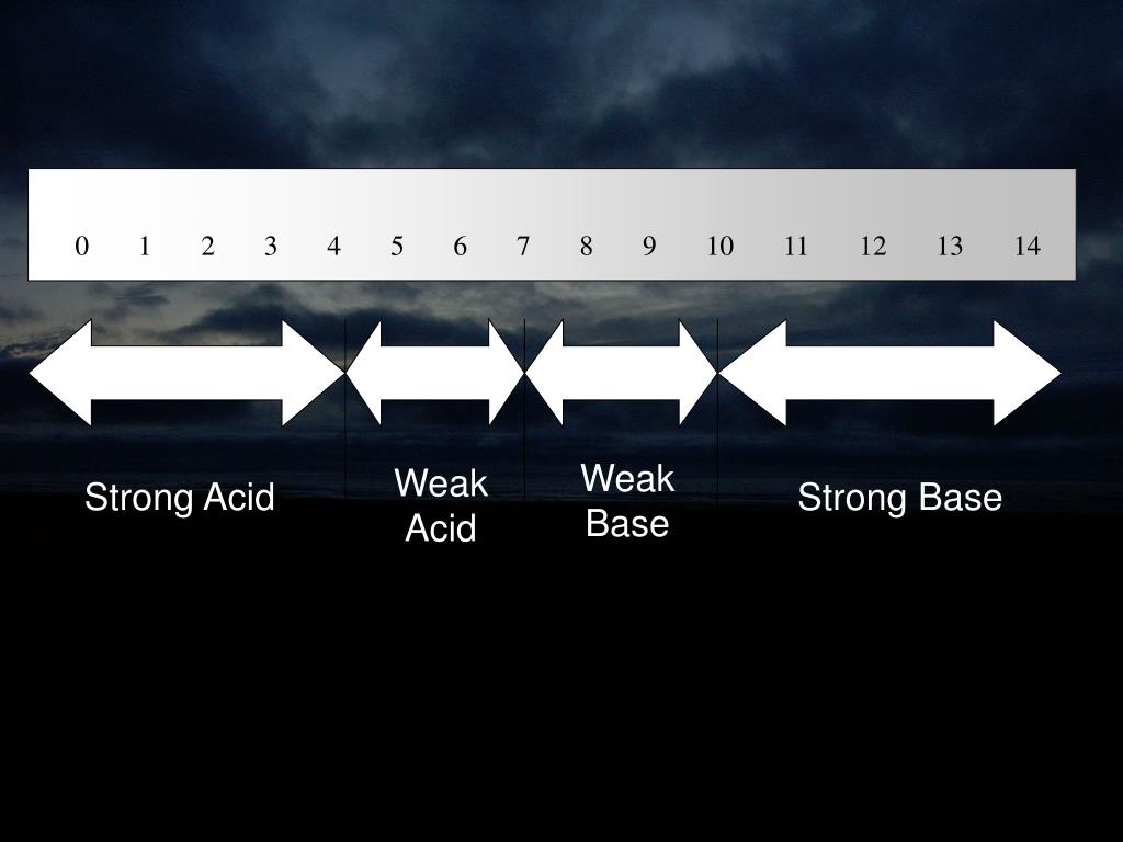 0 1 2 3 4 5 6 7 8 9 10 11 12 13 14 Weak Base Weak Acid Strong Acid Strong Base
