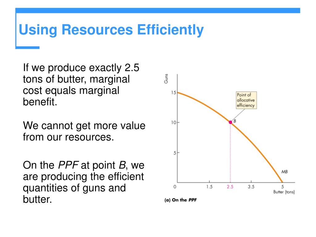 Using Resources Efficiently • If we produce exactly 2.5 tons of butter, marginal cost equals marginal benefit. • We cannot get more value from our resources. • On the PPF at point B, we are producing the efficient quantities of guns and butter.