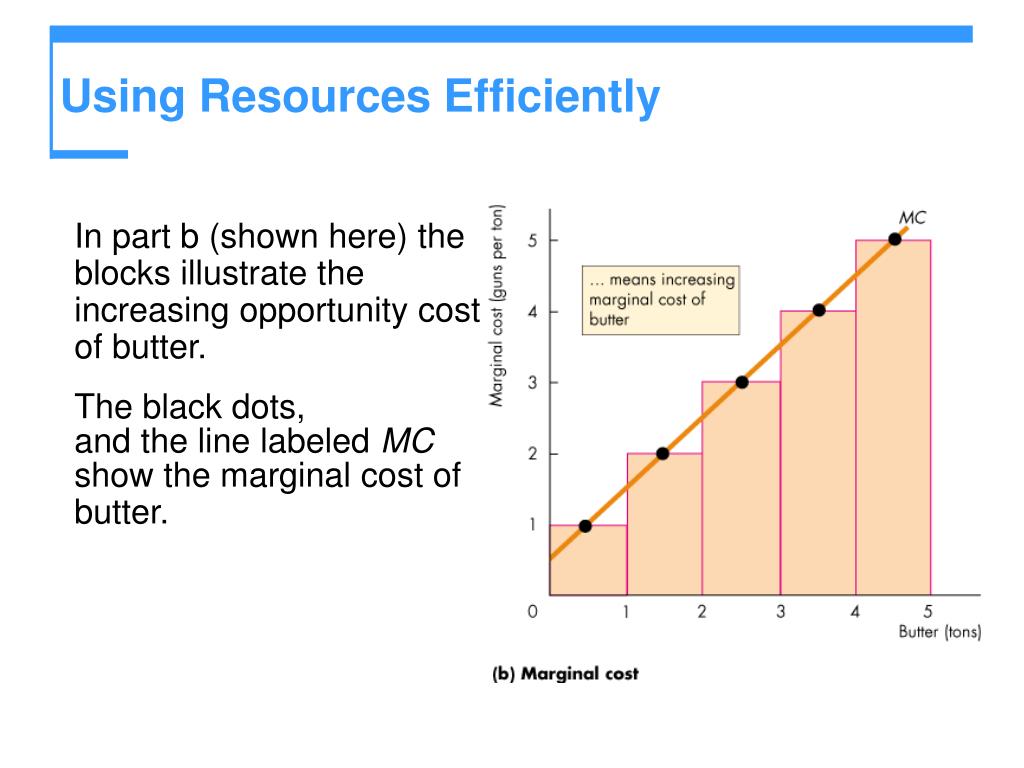 Using Resources Efficiently • In part b (shown here) the blocks illustrate the increasing opportunity cost of butter. • The black dots, • and the line labeled MC • show the marginal cost of butter.