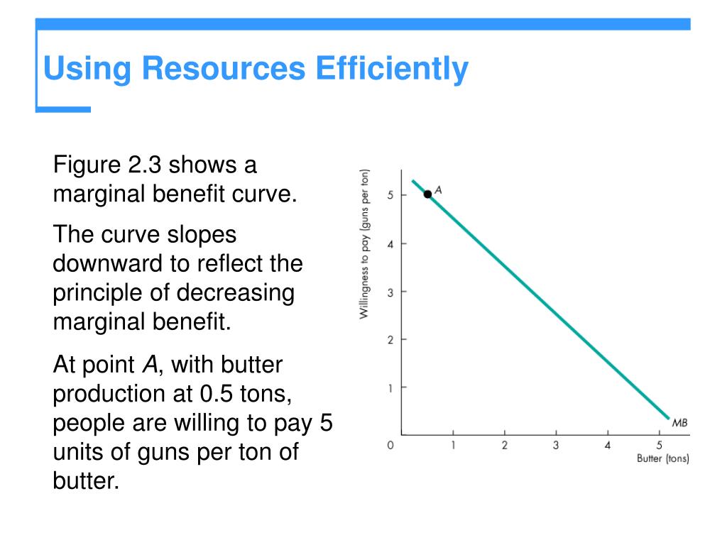 Using Resources Efficiently • Figure 2.3 shows a marginal benefit curve. • The curve slopes downward to reflect the principle of decreasing marginal benefit. • At point A, with butter production at 0.5 tons, people are willing to pay 5 units of guns per ton of butter.