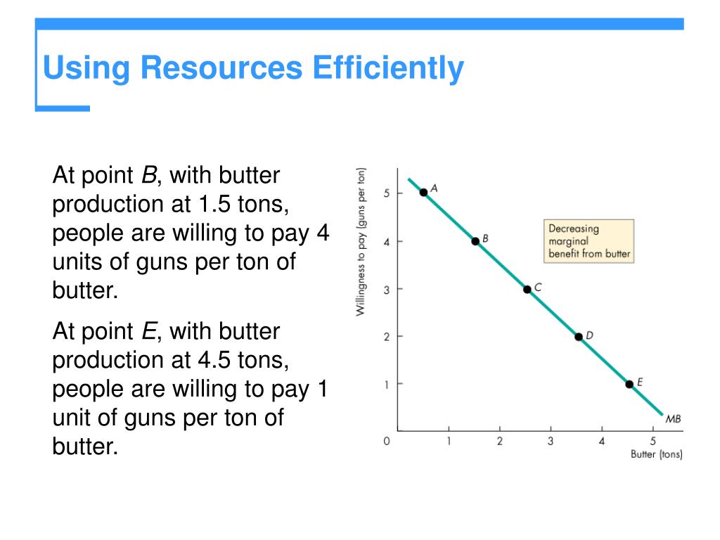 Using Resources Efficiently • At point B, with butter production at 1.5 tons, people are willing to pay 4 units of guns per ton of butter. • At point E, with butter production at 4.5 tons, people are willing to pay 1 unit of guns per ton of butter.