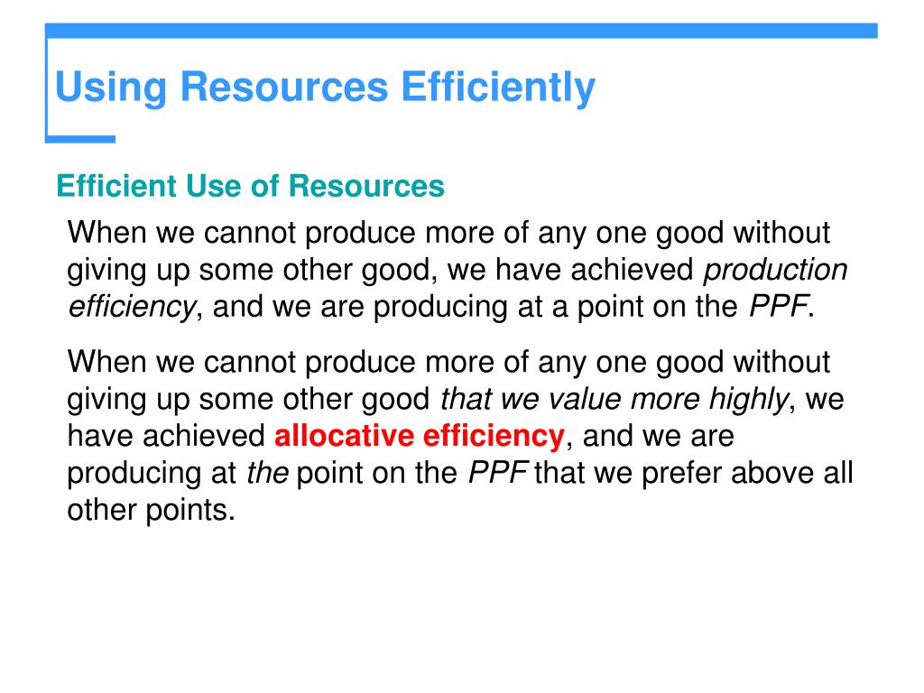 Using Resources Efficiently • Efficient Use of Resources • When we cannot produce more of any one good without giving up some other good, we have achieved production efficiency, and we are producing at a point on the PPF. • When we cannot produce more of any one good without giving up some other good that we value more highly, we have achieved allocative efficiency, and we are producing at the point on the PPF that we prefer above all other points.