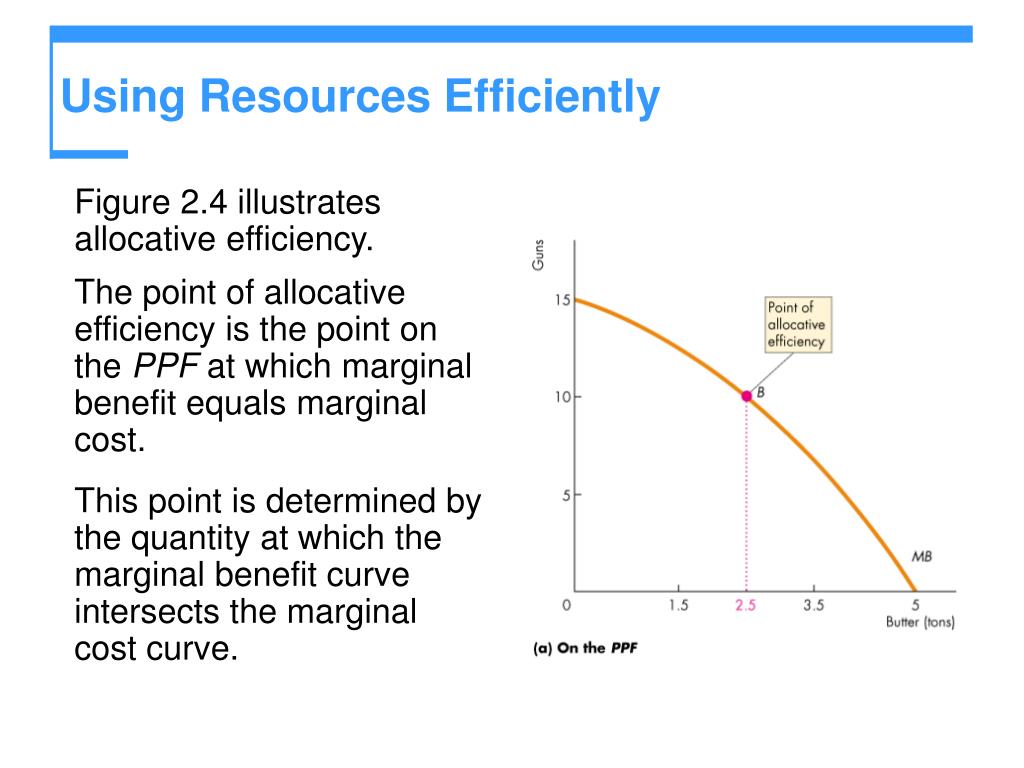 Using Resources Efficiently • Figure 2.4 illustrates allocative efficiency. • The point of allocative efficiency is the point on the PPF at which marginal benefit equals marginal cost. • This point is determined by the quantity at which the marginal benefit curve intersects the marginal cost curve.