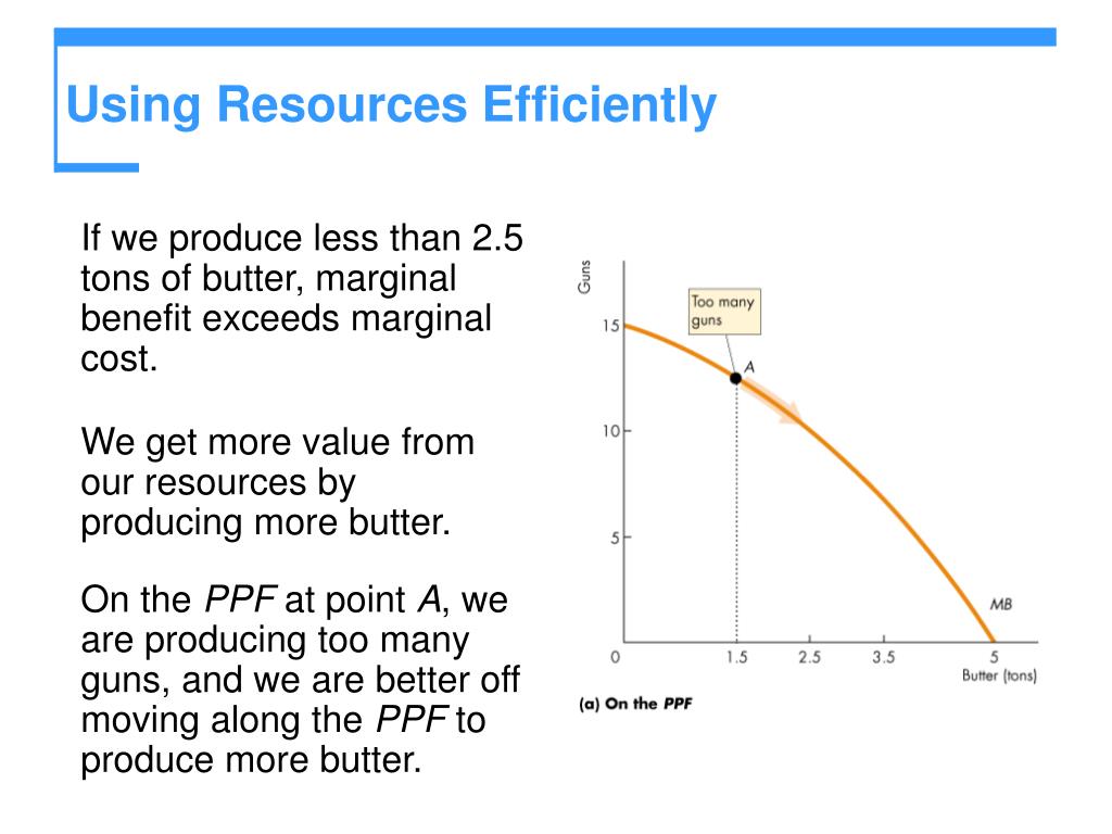 Using Resources Efficiently • If we produce less than 2.5 tons of butter, marginal benefit exceeds marginal cost. • We get more value from our resources by producing more butter. • On the PPF at point A, we are producing too many guns, and we are better off moving along the PPF to produce more butter.