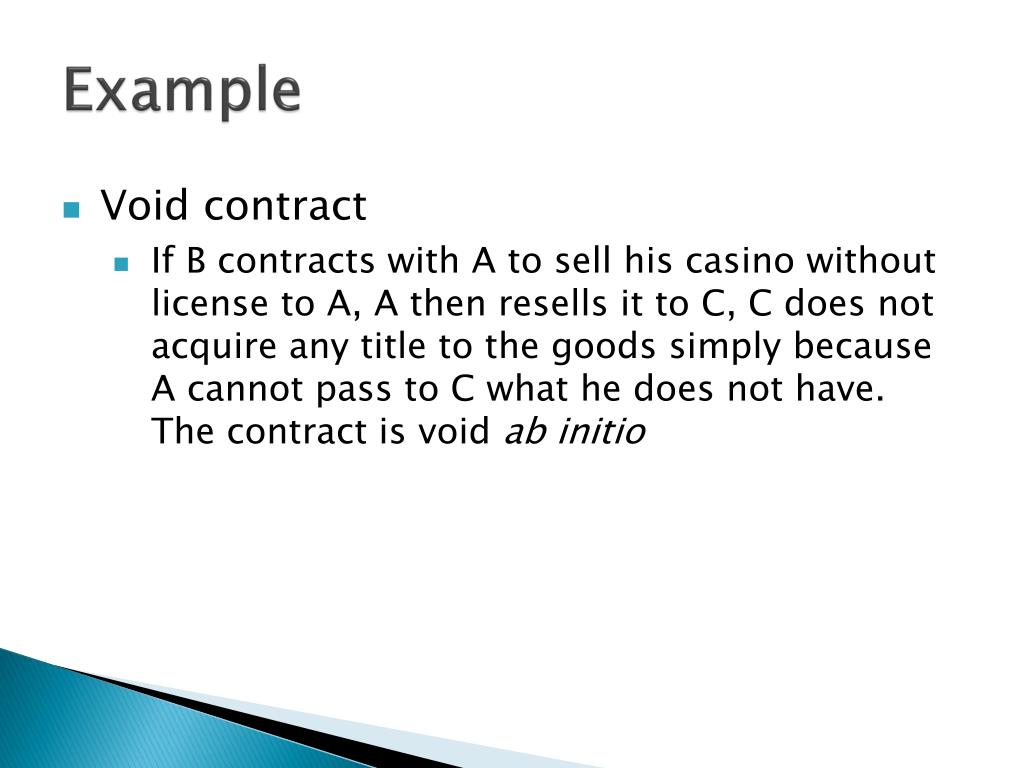 Example • Void contract • If B contracts with A to sell his casino without license to A, A then resells it to C, C does not acquire any title to the goods simply because A cannot pass to C what he does not have. The contract is void ab initio