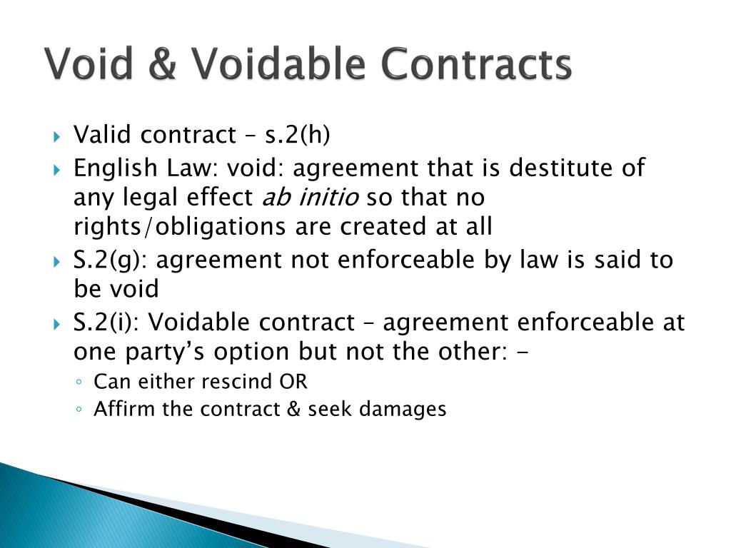 Void & Voidable Contracts • Valid contract – s.2(h) • English Law: void: agreement that is destitute of any legal effect ab initio so that no rights/obligations are created at all • S.2(g): agreement not enforceable by law is said to be void • S.2(i): Voidable contract – agreement enforceable at one party’s option but not the other: - • Can either rescind OR • Affirm the contract & seek damages