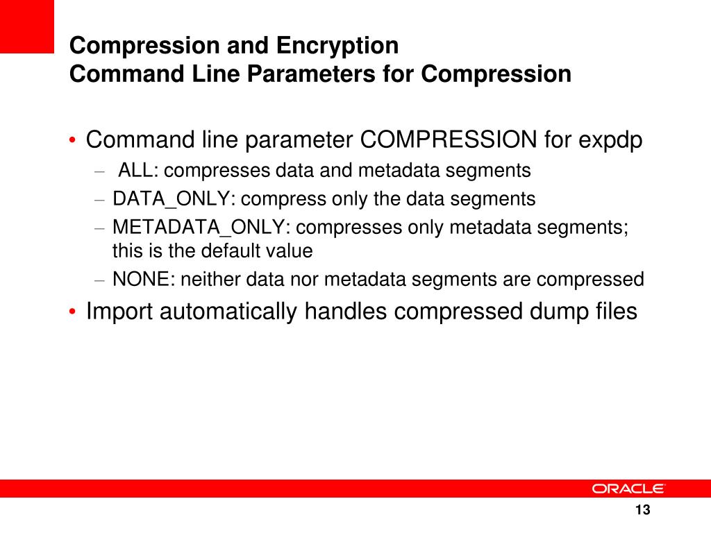 Compression and EncryptionWhy Compress Data Pump Dump Files? Take up less space on disk Are copied faster Require fewer I/Os to read or write data