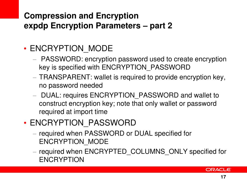 Compression and Encryptionexpdp Encryption Parameters – part 2 • ENCRYPTION_MODE • PASSWORD: encryption password used to create encryption key is specified with ENCRYPTION_PASSWORD • TRANSPARENT: wallet is required to provide encryption key, no password needed • DUAL: requires ENCRYPTION_PASSWORD and wallet to construct encryption key; note that only wallet or password required at import time • ENCRYPTION_PASSWORD • required when PASSWORD or DUAL specified for ENCRYPTION_MODE • required when ENCRYPTED_COLUMNS_ONLY specified for ENCRYPTION