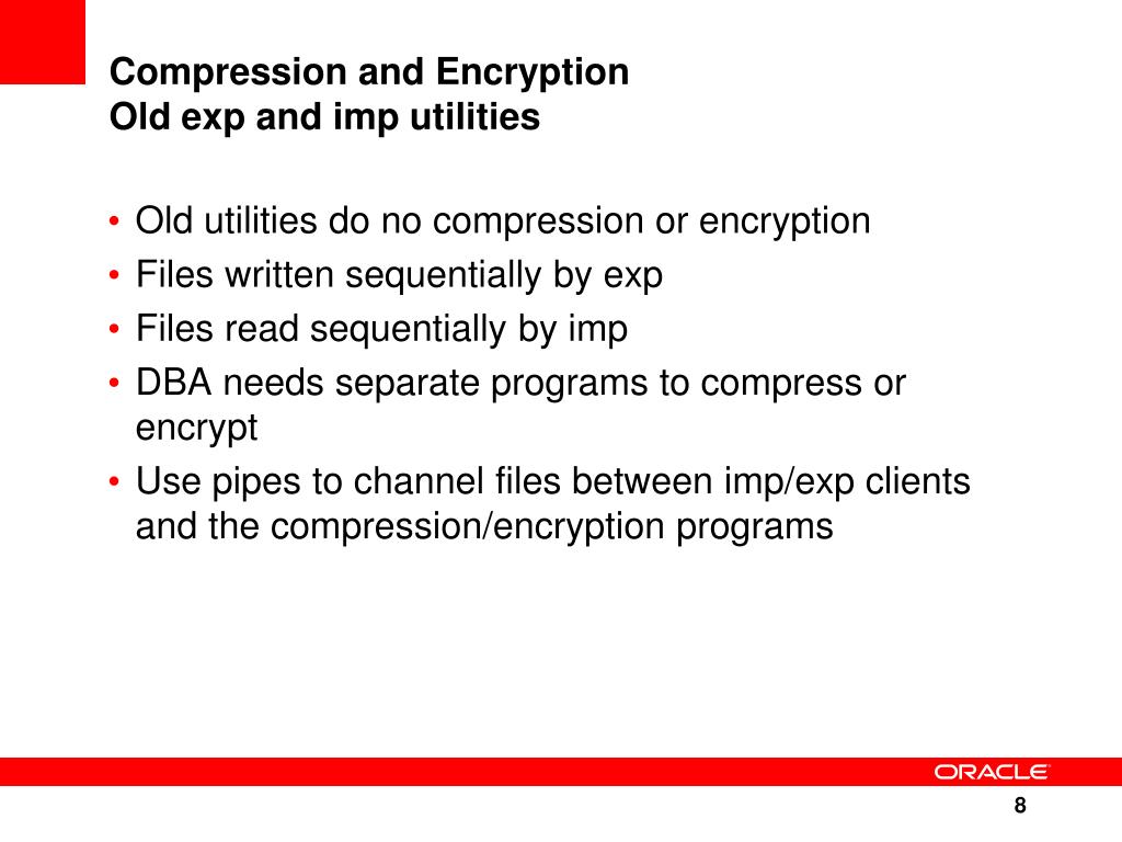 Compression and Encryption Old exp and imp utilities • Old utilities do no compression or encryption • Files written sequentially by exp • Files read sequentially by imp • DBA needs separate programs to compress or encrypt • Use pipes to channel files between imp/exp clients and the compression/encryption programs