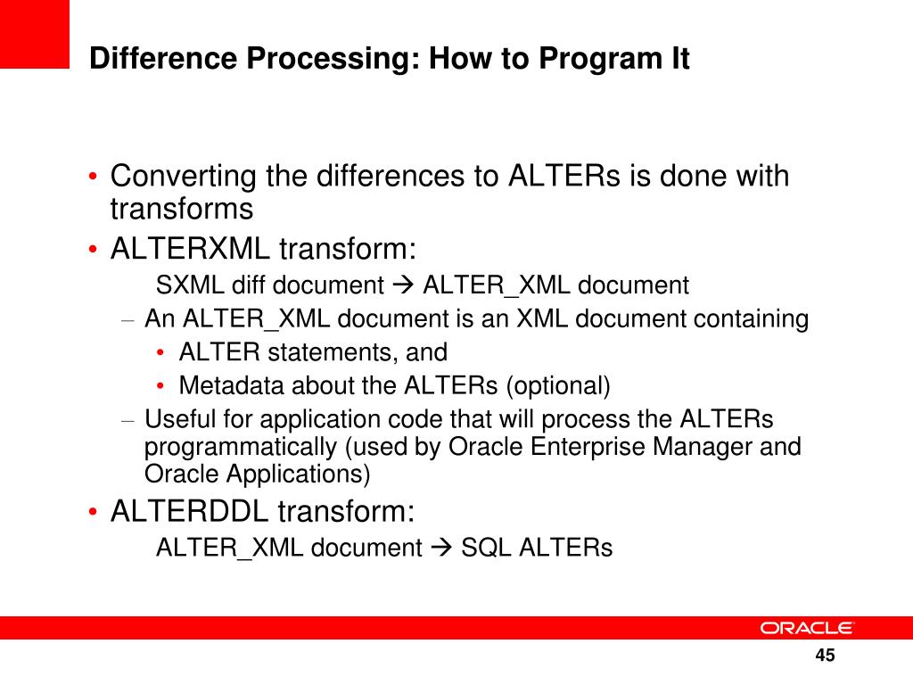 Difference Processing: How to Program It Converting the differences to ALTERs is done with transforms ALTERXML transform: SXML diff document ALTER_XML document An ALTER_XML document is an XML document containing ALTER statements, and Metadata about the ALTERs (optional) Useful for application code that will process the ALTERs programmatically (used by Oracle Enterprise Manager and Oracle Applications) ALTERDDL transform: ALTER_XML document SQL ALTERs