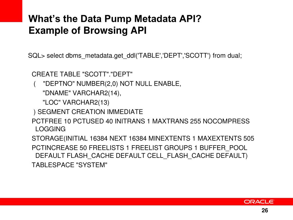 What’s the Data Pump Metadata API?Example of Browsing API SQL> select dbms_metadata.get_ddl('TABLE','DEPT','SCOTT') from dual; CREATE TABLE "SCOTT"."DEPT" ( "DEPTNO" NUMBER(2,0) NOT NULL ENABLE, "DNAME" VARCHAR2(14), "LOC" VARCHAR2(13) ) SEGMENT CREATION IMMEDIATE PCTFREE 10 PCTUSED 40 INITRANS 1 MAXTRANS 255 NOCOMPRESS LOGGING STORAGE(INITIAL 16384 NEXT 16384 MINEXTENTS 1 MAXEXTENTS 505 PCTINCREASE 50 FREELISTS 1 FREELIST GROUPS 1 BUFFER_POOL DEFAULT FLASH_CACHE DEFAULT CELL_FLASH_CACHE DEFAULT) TABLESPACE "SYSTEM"