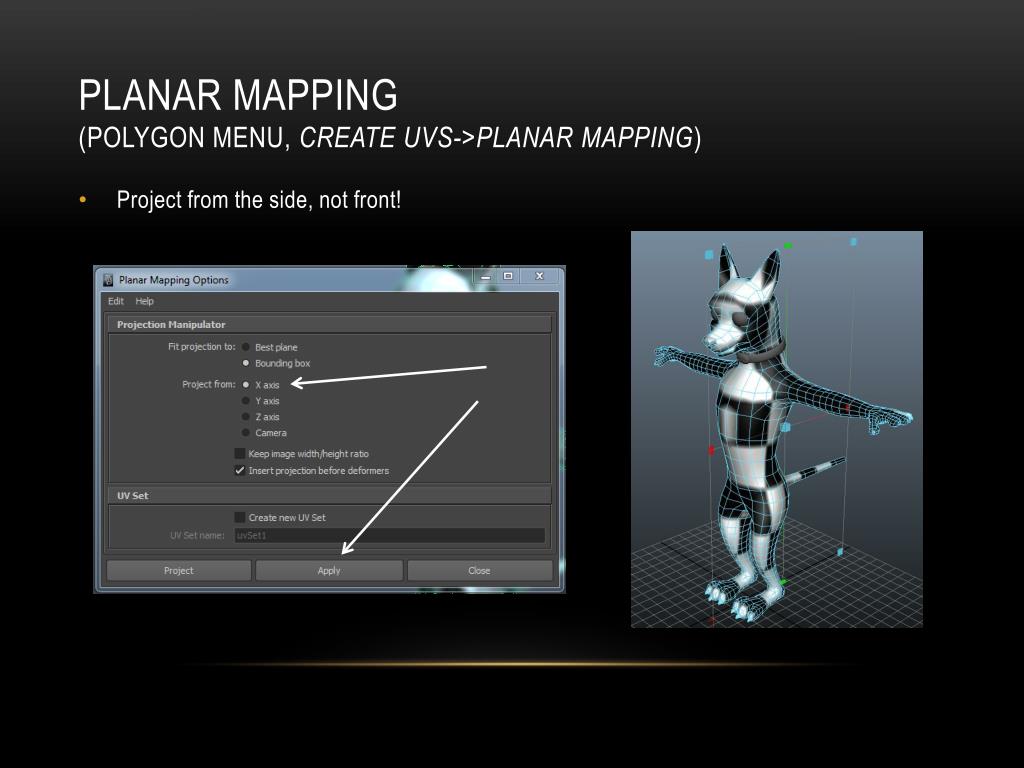 Planar Mapping(Polygon menu, Create Uvs->Planar Mapping) • Project from the side, not front!