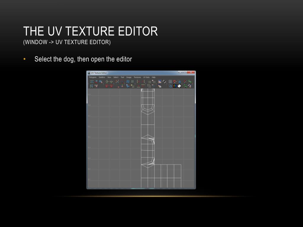 The UV Texture editor(Window -> UV Texture Editor) • Select the dog, then open the editor