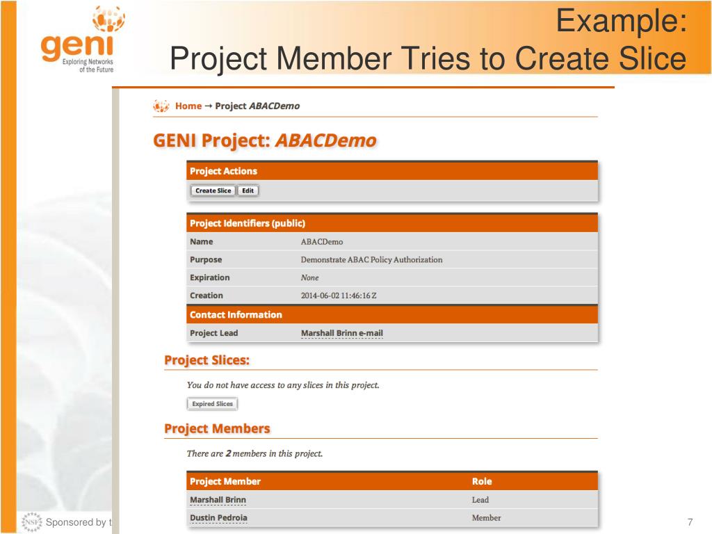 A few details… • Due to ABAC syntax rules, entities are referenced in these ABAC rules by a ‘flattened’ version of their URN • Determining the ‘subjects’ of a given call requires searching both • ‘options’ argument (‘match’ and ‘fields’ elements) • ‘arguments’ dictionary composed of other API call arguments, e.g. {‘project_urn’ : “urn:publicid:IDN+ch.geni.net+project+MYPROJ”} urn:publicid:IDN+ch.geni.net+user+mbrinn urn_publicid_IDN_ch_geni_net_user_mbrinn