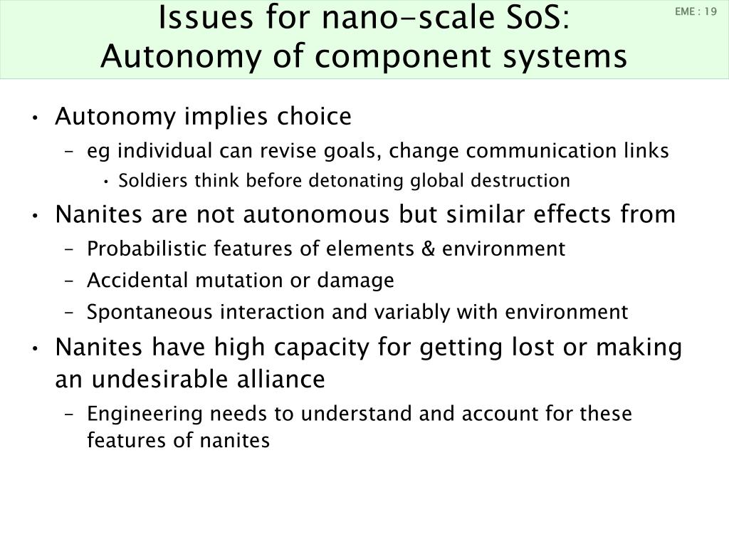 Issues for nano-scale SoS:Autonomy of component systems • Autonomy implies choice • eg individual can revise goals, change communication links • Soldiers think before detonating global destruction • Nanites are not autonomous but similar effects from • Probabilistic features of elements & environment • Accidental mutation or damage • Spontaneous interaction and variably with environment • Nanites have high capacity for getting lost or making an undesirable alliance • Engineering needs to understand and account for these features of nanites