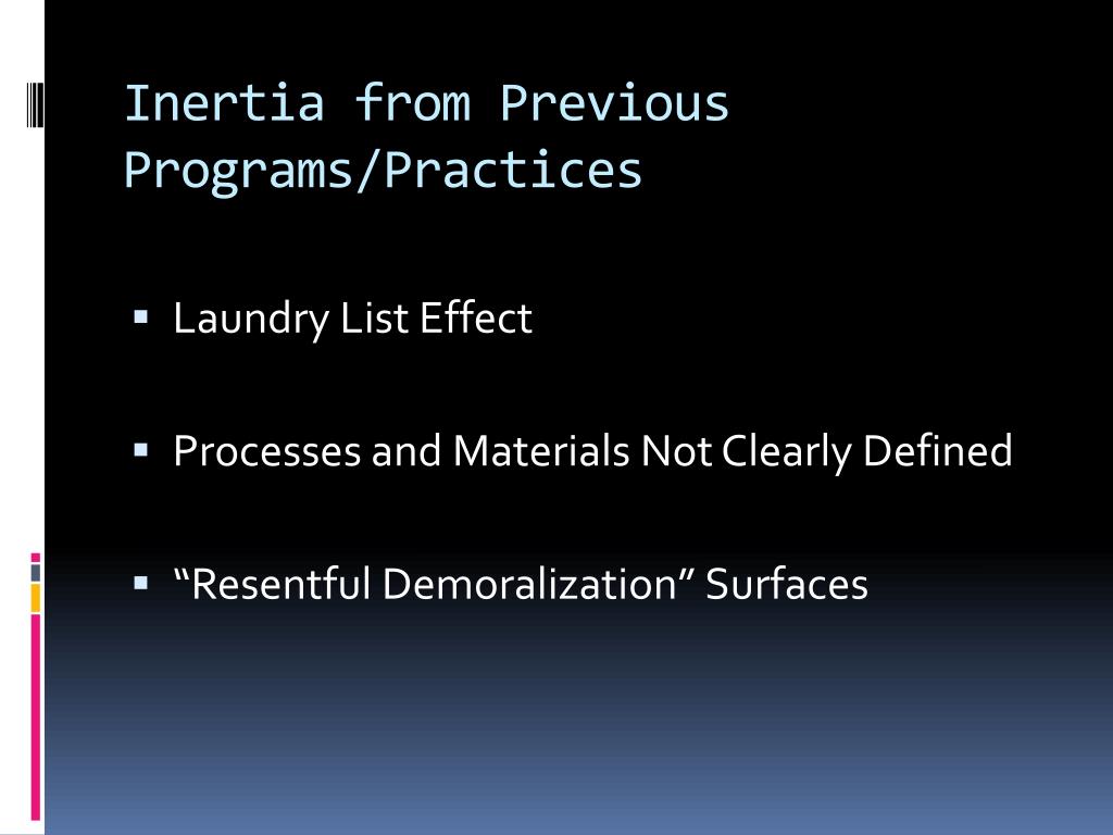 Inertia from Previous Programs/Practices • Laundry List Effect • Processes and Materials Not Clearly Defined • “Resentful Demoralization” Surfaces