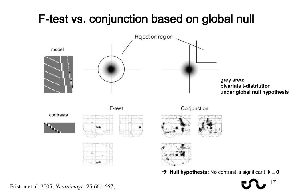 F-test vs. conjunction based on global null grey area: bivariate t-distriution under global null hypothesis • Null hypothesis: No contrast is significant: k = 0 Friston et al. 2005, Neuroimage, 25:661-667.