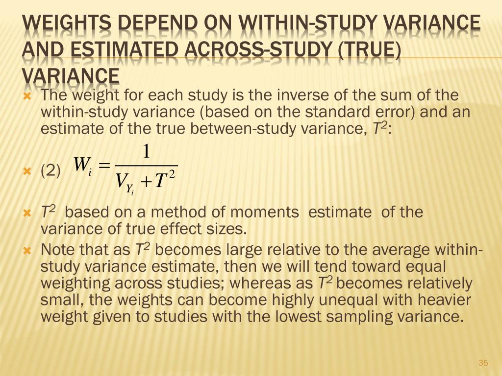 The weight for each study is the inverse of the sum of the within-study variance (based on the standard error) and an estimate of the true between-study variance, T2: (2) T2 based on a method of moments estimate of the variance of true effect sizes. Note that as T2becomes large relative to the average within-study variance estimate, then we will tend toward equal weighting across studies; whereas as T2becomes relatively small, the weights can become highly unequal with heavier weight given to studies with the lowest sampling variance. Weights depend on within-study variance and estimated across-study (true) variance