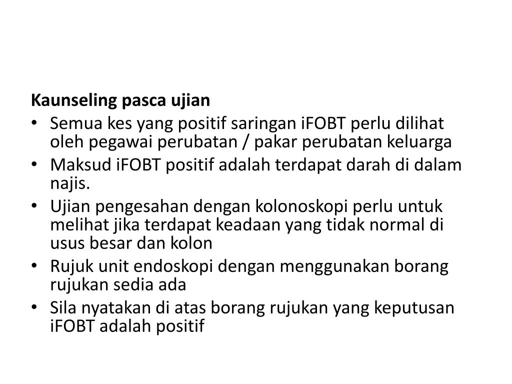 Kaunselingpascaujian • Semuakes yang positifsaringaniFOBTperludilihatolehpegawaiperubatan / pakarperubatankeluarga • MaksudiFOBTpositifadalahterdapatdarahdidalamnajis. • Ujianpengesahandengankolonoskopiperluuntukmelihatjikaterdapatkeadaan yang tidak normal diususbesardankolon • Rujuk unit endoskopidenganmenggunakanborangrujukansediaada • Silanyatakandiatasborangrujukan yang keputusaniFOBTadalahpositif
