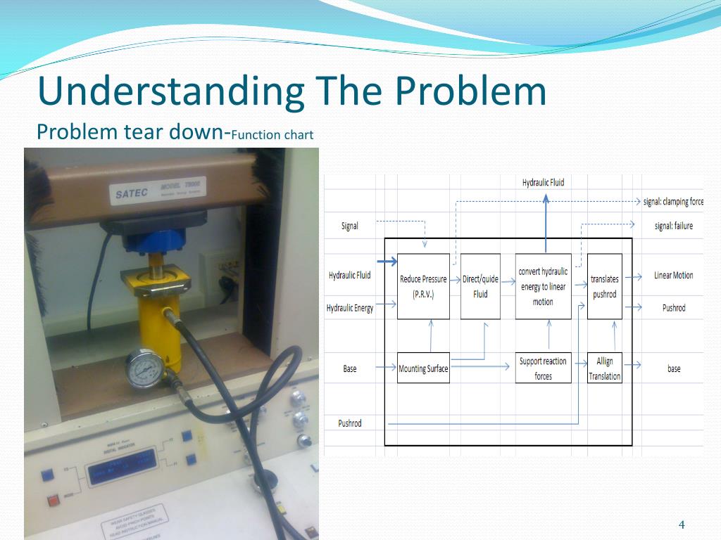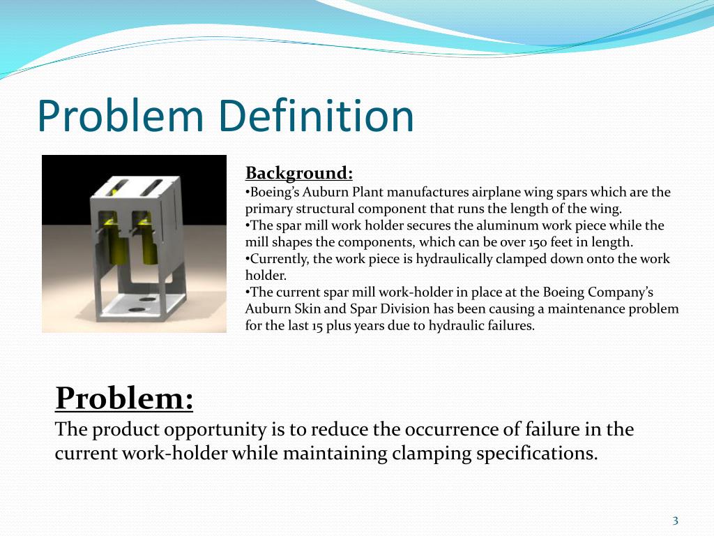 Problem Definition • Background: • Boeing’s Auburn Plant manufactures airplane wing spars which are the primary structural component that runs the length of the wing. • The spar mill work holder secures the aluminum work piece while the mill shapes the components, which can be over 150 feet in length. • Currently, the work piece is hydraulically clamped down onto the work holder. • The current spar mill work-holder in place at the Boeing Company’s Auburn Skin and Spar Division has been causing a maintenance problem for the last 15 plus years due to hydraulic failures. Problem: The product opportunity is to reduce the occurrence of failure in the current work-holder while maintaining clamping specifications.