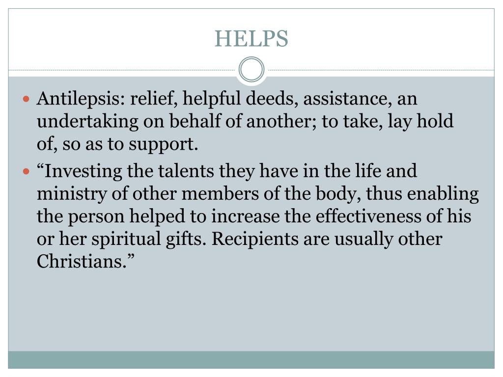 HELPS Antilepsis: relief, helpful deeds, assistance, an undertaking on behalf of another; to take, lay hold of, so as to support. “Investing the talents they have in the life and ministry of other members of the body, thus enabling the person helped to increase the effectiveness of his or her spiritual gifts. Recipients are usually other Christians.”