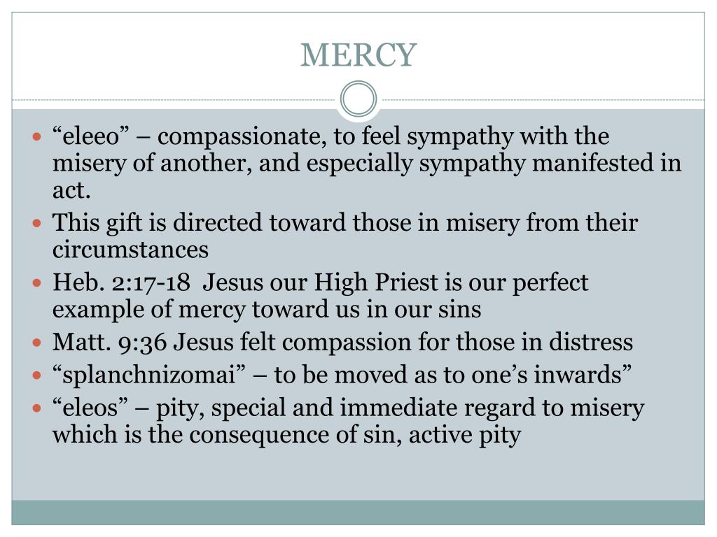 MERCY “eleeo” – compassionate, to feel sympathy with the misery of another, and especially sympathy manifested in act. This gift is directed toward those in misery from their circumstances Heb. 2:17-18 Jesus our High Priest is our perfect example of mercy toward us in our sins Matt. 9:36 Jesus felt compassion for those in distress “splanchnizomai” – to be moved as to one’s inwards” “eleos” – pity, special and immediate regard to misery which is the consequence of sin, active pity