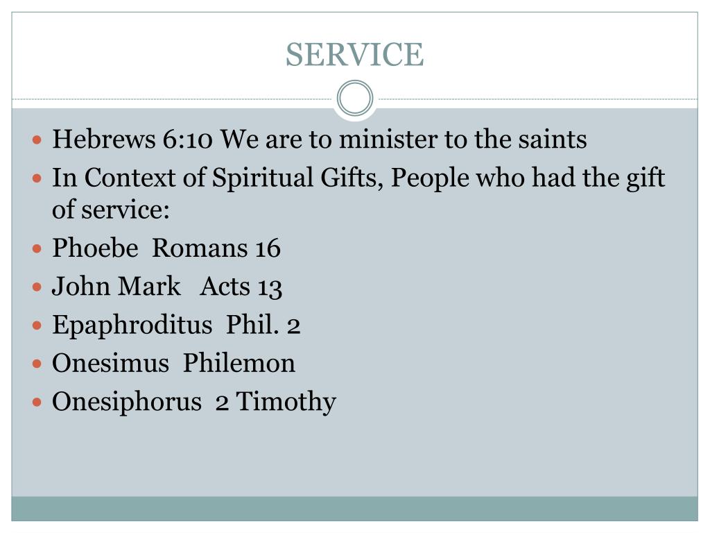 SERVICE Hebrews 6:10 We are to minister to the saints In Context of Spiritual Gifts, People who had the gift of service: Phoebe Romans 16 John Mark Acts 13 Epaphroditus Phil. 2 Onesimus Philemon Onesiphorus 2 Timothy