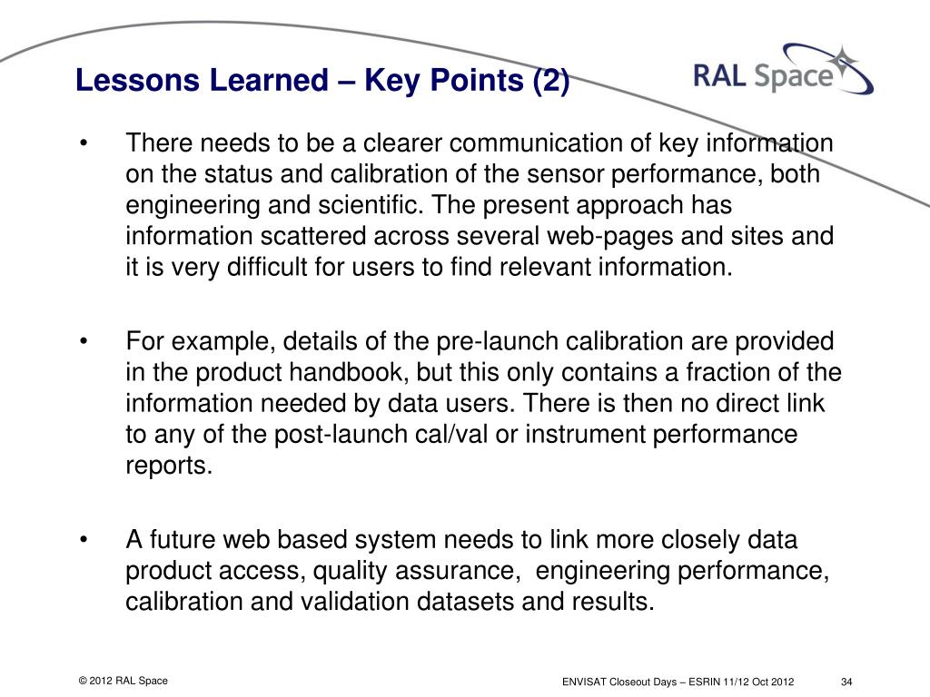 Lessons Learned – Key Points (2) • There needs to be a clearer communication of key information on the status and calibration of the sensor performance, both engineering and scientific. The present approach has information scattered across several web-pages and sites and it is very difficult for users to find relevant information. • For example, details of the pre-launch calibration are provided in the product handbook, but this only contains a fraction of the information needed by data users. There is then no direct link to any of the post-launch cal/val or instrument performance reports. • A future web based system needs to link more closely data product access, quality assurance, engineering performance, calibration and validation datasets and results.