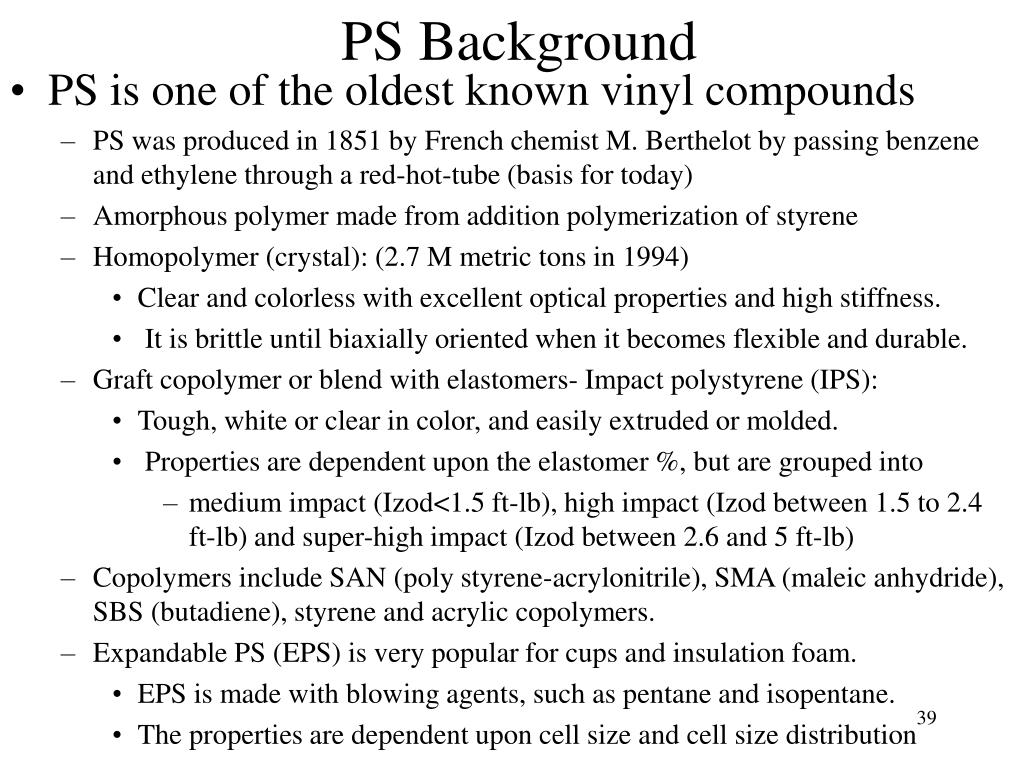 PS Background • PS is one of the oldest known vinyl compounds • PS was produced in 1851 by French chemist M. Berthelot by passing benzene and ethylene through a red-hot-tube (basis for today) • Amorphous polymer made from addition polymerization of styrene • Homopolymer (crystal): (2.7 M metric tons in 1994) • Clear and colorless with excellent optical properties and high stiffness. • It is brittle until biaxially oriented when it becomes flexible and durable. • Graft copolymer or blend with elastomers- Impact polystyrene (IPS): • Tough, white or clear in color, and easily extruded or molded. • Properties are dependent upon the elastomer %, but are grouped into • medium impact (Izod<1.5 ft-lb), high impact (Izod between 1.5 to 2.4 ft-lb) and super-high impact (Izod between 2.6 and 5 ft-lb) • Copolymers include SAN (poly styrene-acrylonitrile), SMA (maleic anhydride), SBS (butadiene), styrene and acrylic copolymers. • Expandable PS (EPS) is very popular for cups and insulation foam. • EPS is made with blowing agents, such as pentane and isopentane. • The properties are dependent upon cell size and cell size distribution