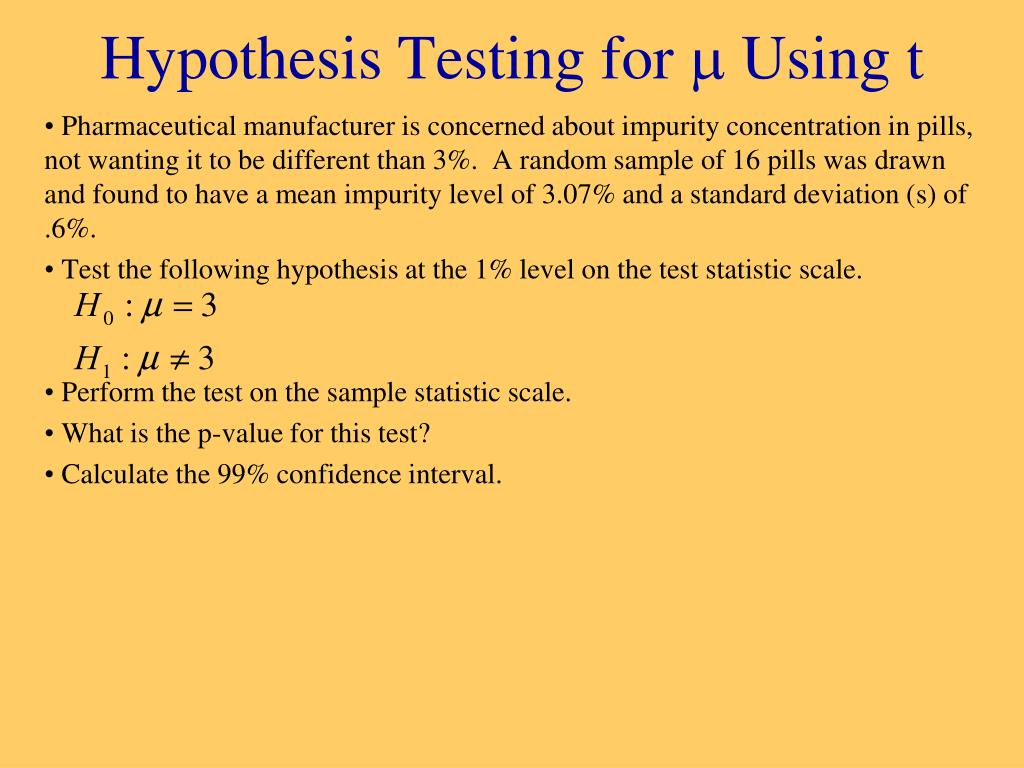 Hypothesis Testing for Using t Pharmaceutical manufacturer is concerned about impurity concentration in pills, not wanting it to be different than 3%. A random sample of 16 pills was drawn and found to have a mean impurity level of 3.07% and a standard deviation (s) of .6%. Test the following hypothesis at the 1% level on the test statistic scale. Perform the test on the sample statistic scale. What is the p-value for this test? Calculate the 99% confidence interval.