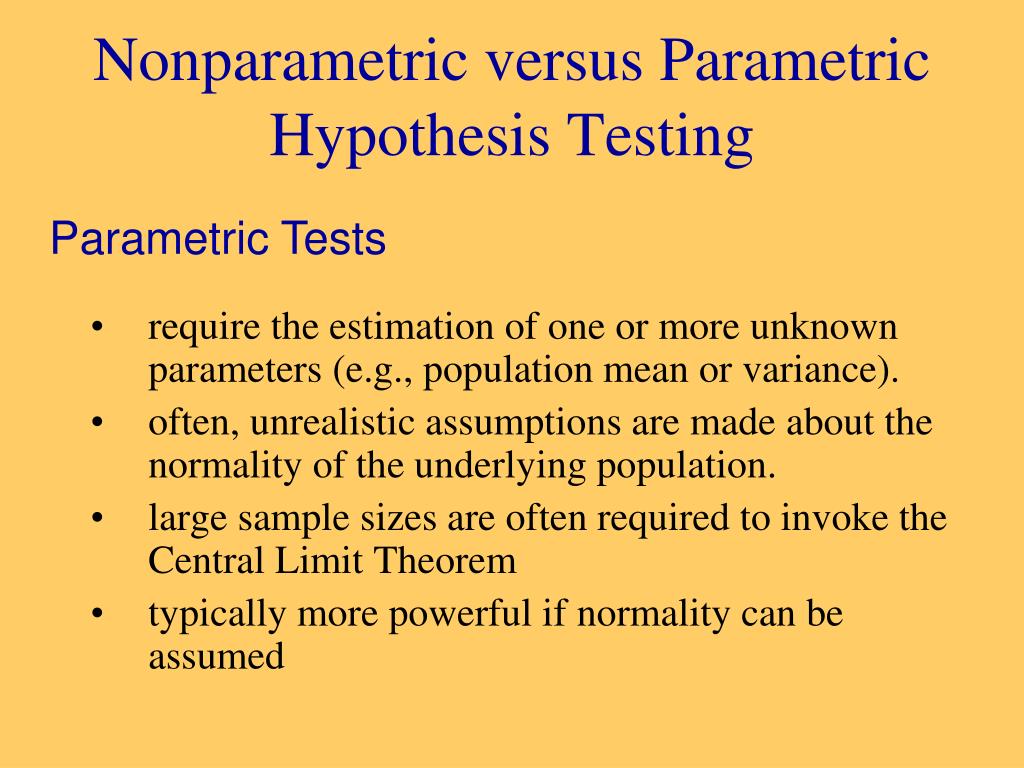 Nonparametric versus Parametric HypothesisTesting require the estimation of one or more unknown parameters (e.g., population mean or variance). often, unrealistic assumptions are made about the normality of the underlying population. large sample sizes are often required to invoke the Central Limit Theorem typically more powerful if normality can be assumed Parametric Tests