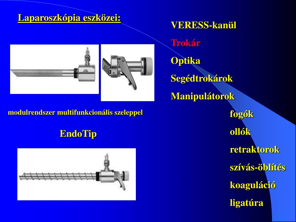 Laparoszkópia eszközei: VERESS-kanül Trokár Optika Segédtrokárok Manipulátorok fogók ollók retraktorok szívás-öblítés koaguláció ligatúra modulrendszer multifunkcionális szeleppel EndoTip
