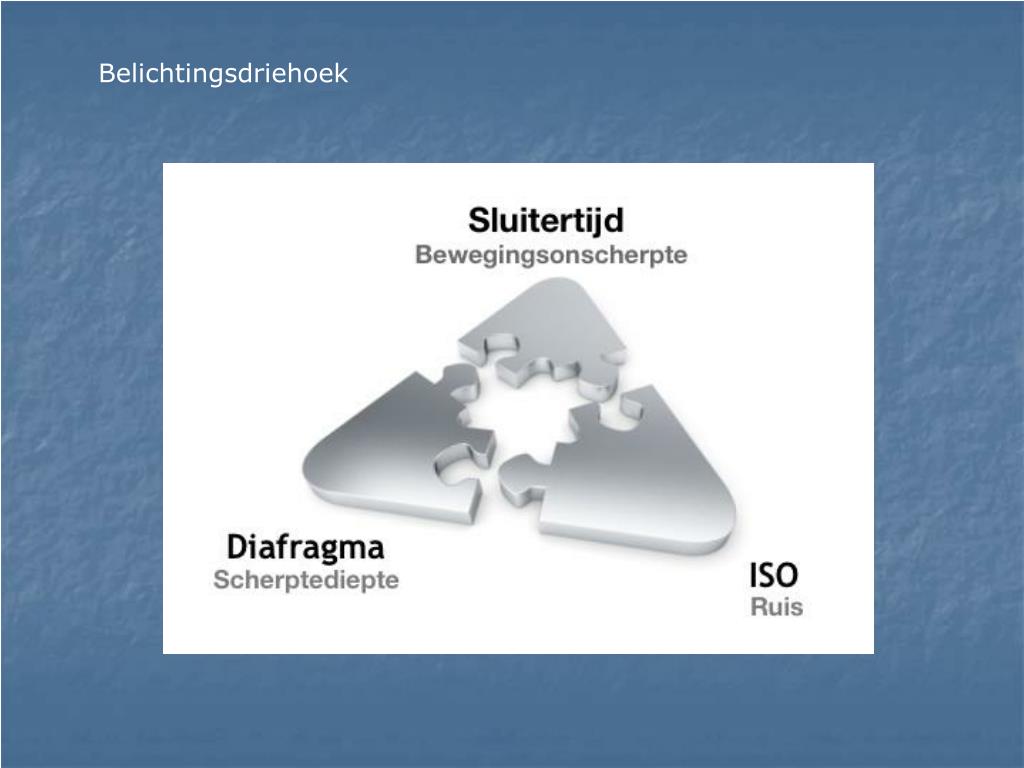 Belichtingsparameters • Sluitersnelheid • Diafragma • Gevoeligheid Gemeten licht Belichting De hoeveelheid licht nodig voor het vastleggen van het onderwerp op de sensor van het fototoestel. Gemeten door een lichtmeter. Is in de huidige toestellen ingebouwd en vraagt geen tussenkomst van de gebruiker.