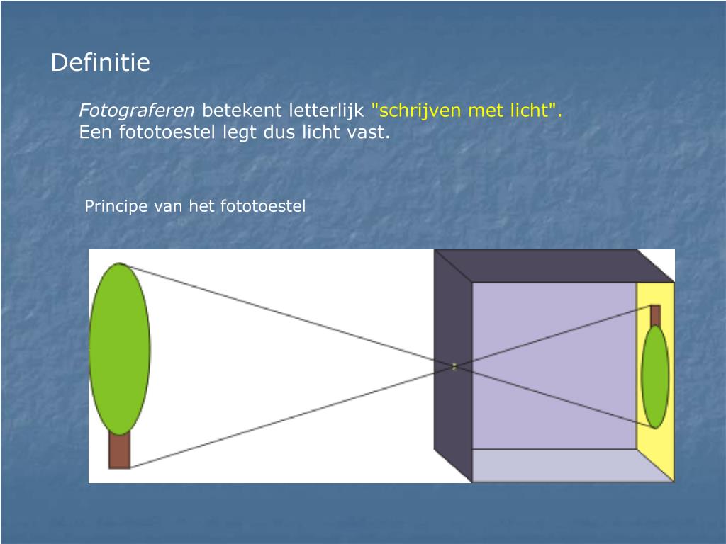Principe van het fototoestel Definitie Fotograferen betekent letterlijk "schrijven met licht". Een fototoestel legt dus licht vast.