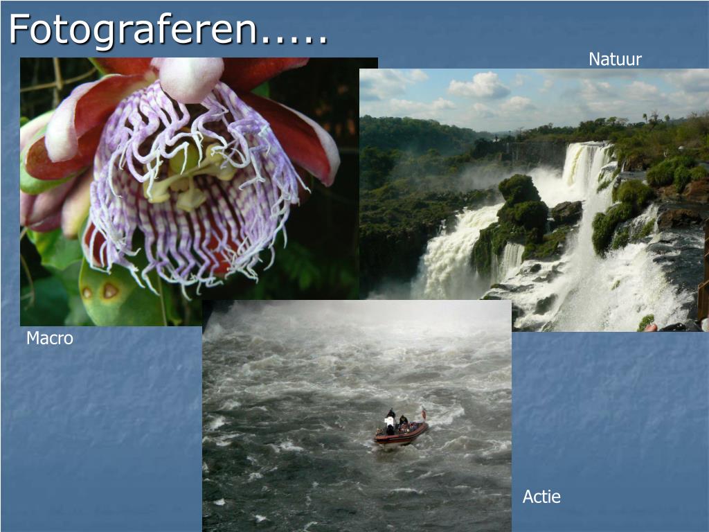 Sluitersnelheid Is de tijd waarmee de lens opent en sluit en hoelang we onze sensor gaan blootstellen aan invallend licht. Te weinig licht betekent dat je detail verliest (verdwijnt in zwart), te veel licht ook (verdwijnt in wit). De sluitertijd van de camera bepaalt hoeveel detail je in een foto ziet. Maar ook hoe scherp of onscherp de foto er uit komt te zien. Wordt aangegeven in delen van een seconde Bv. 1/8 1/15 1/40 1/50 1/60 1/125 1/500 1/1000