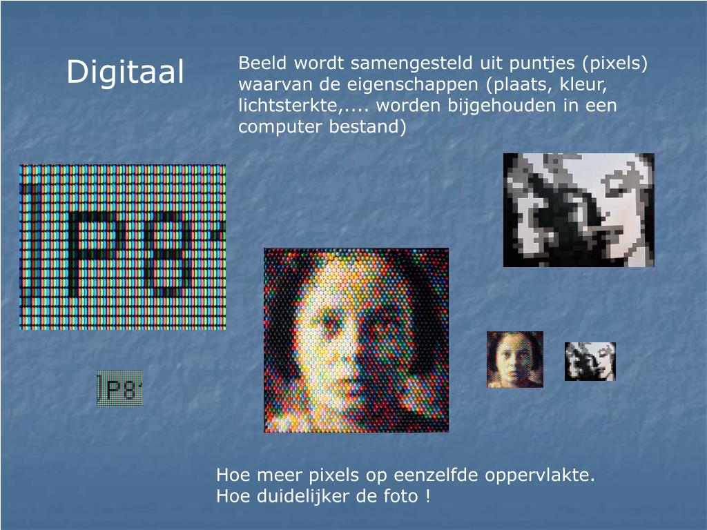 Digitaal Beeld wordt samengesteld uit puntjes (pixels) waarvan de eigenschappen (plaats, kleur, lichtsterkte,.... worden bijgehouden in een computer bestand) Hoe meer pixels op eenzelfde oppervlakte. Hoe duidelijker de foto !