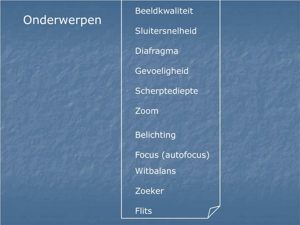 Beeldkwaliteit Sluitersnelheid Diafragma Gevoeligheid Scherptediepte Zoom Belichting Focus (autofocus) Witbalans Zoeker Flits Onderwerpen