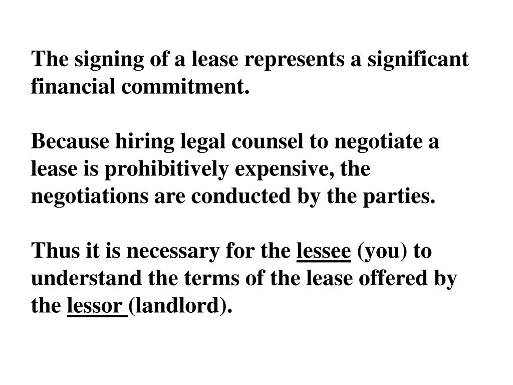 The signing of a lease represents a significant financial commitment.Because hiring legal counsel to negotiate a lease is prohibitively expensive, the negotiations are conducted by the parties.Thus it is necessary for the lessee (you) to understand the terms of the lease offered by the lessor (landlord).