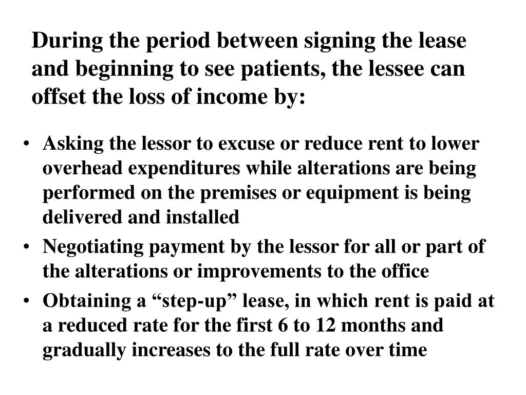 During the period between signing the lease and beginning to see patients, the lessee can offset the loss of income by: • Asking the lessor to excuse or reduce rent to lower overhead expenditures while alterations are being performed on the premises or equipment is being delivered and installed • Negotiating payment by the lessor for all or part of the alterations or improvements to the office • Obtaining a “step-up” lease, in which rent is paid at a reduced rate for the first 6 to 12 months and gradually increases to the full rate over time
