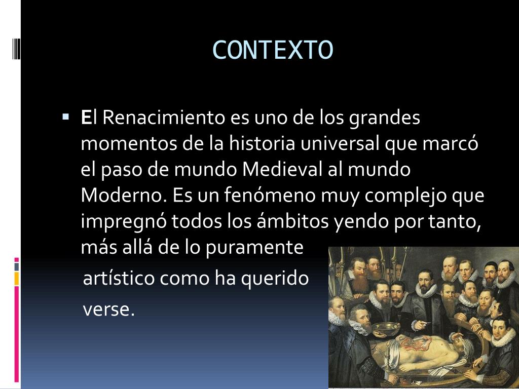 CONTEXTO • El Renacimiento es uno de los grandes momentos de la historia universal que marcó el paso de mundo Medieval al mundo Moderno. Es un fenómeno muy complejo que impregnó todos los ámbitos yendo por tanto, más allá de lo puramente artístico como ha querido verse.